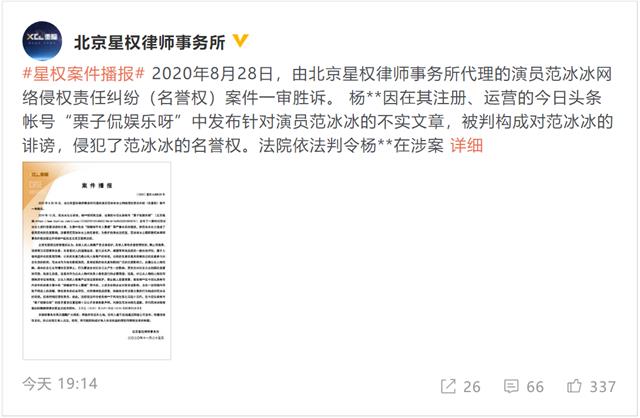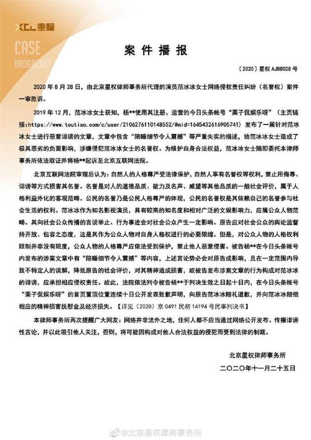 11月25日,北京星权律师事务所发表案件播报,透露范冰冰名誉权案件一审胜诉。据悉,有网友公开散播范冰冰为了1200万陪睡的谣言,造成范冰冰名誉受损,范冰冰社会评价降低,造成恶劣影响,所以范冰冰选择通过法律手段维权。最后法院认定被告侵犯范冰冰名誉权,判决被告向范冰冰公开道歉,并且还要赔偿范冰冰损失合计1.8万元。