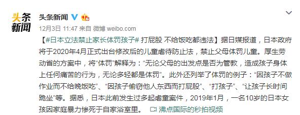 原来,日本政府将于2020年4月正式出台修改后的儿童虐待防止法,禁止父母体罚儿童。而“体罚”解释为:“无论父母的出发点是否为管教,造成孩子身体上任何痛苦的行为,无论多轻都是体罚”。
