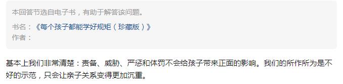有一句来自《每个孩子都能学好规矩(珍藏版)》的话是个很好的回答:基本上我们非常清楚:责备、威胁、严惩和体罚不会给孩子带来正面的影响。我们的所作所为是不好的示范,只会让亲子关系变得更加沉重。