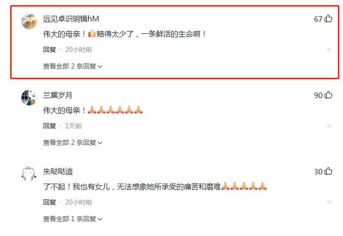 网友评论:伟大的母亲!赔得太少了,一条鲜活的生命啊!
