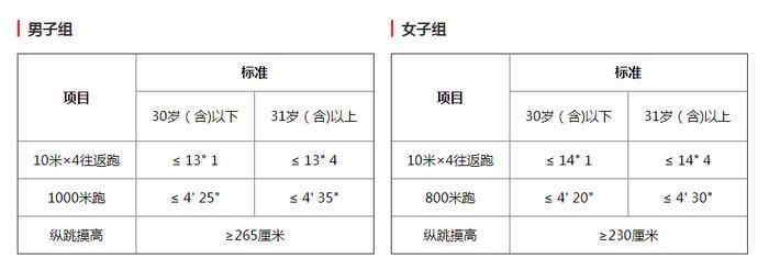 公务员体能测评一般分为四组,男子30岁(含)以下,男子31岁(含)以上,女子30岁(含)以下,女子31岁(含)以上。考试内容为1000米/800米跑、10米×4往返跑、纵跳摸高,合格标准如下所示: