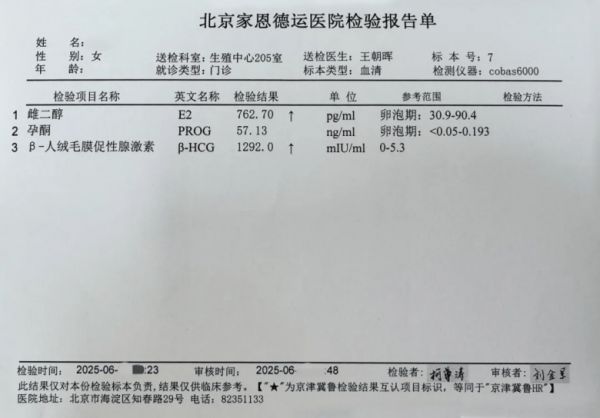 6月中旬,荣女士身体调理就绪,王朝晖主任为其安排胚胎解冻移植。术后14天,血HCG翻倍良好,显示“怀孕成功”,拿到报告单时,夫妻俩非常激动,三年等待,四次失败终迎圆满。