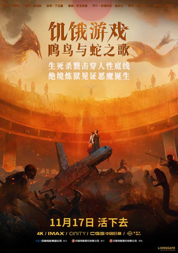 《饥饿游戏:鸣鸟与蛇之歌》由美国狮门影片公司出品,中国电影集团公司进口,中国电影股份有限公司发行、译制。弗朗西斯·劳伦斯执导,汤姆·布莱斯,瑞秋·泽格勒,彼特·丁拉基,詹森·舒瓦兹曼,亨特·莎弗等主演,影片将以4K/IMAX/CINITY/CGS中国巨幕/DTSX版本于11月17日全球同步上映。