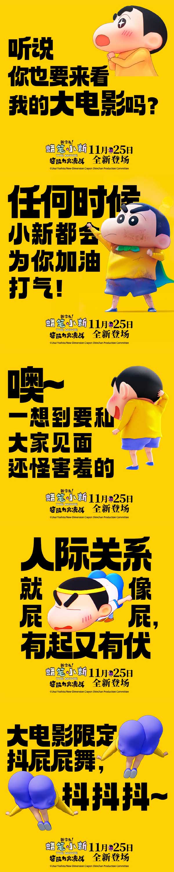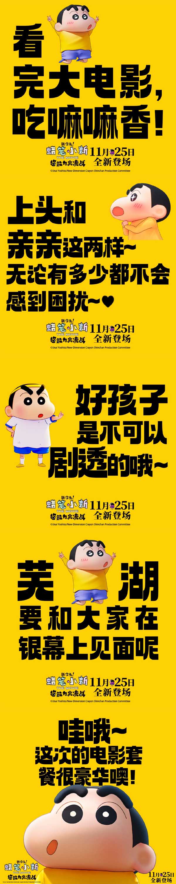 影片由日本SHIN-EI动画株式会社出品,中国电影集团公司进口,中国电影股份有限公司发行、译制,上海华桦文化传媒有限公司协助推广。将于11月25日在全国上映,只有在2023年可以看到的小新,在电影院里等你赴约!