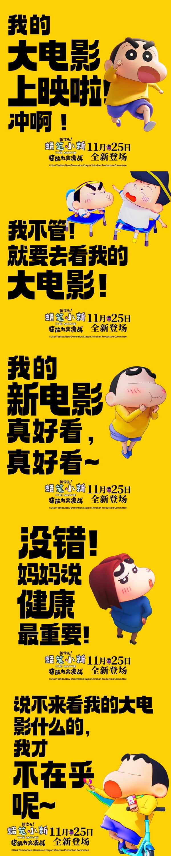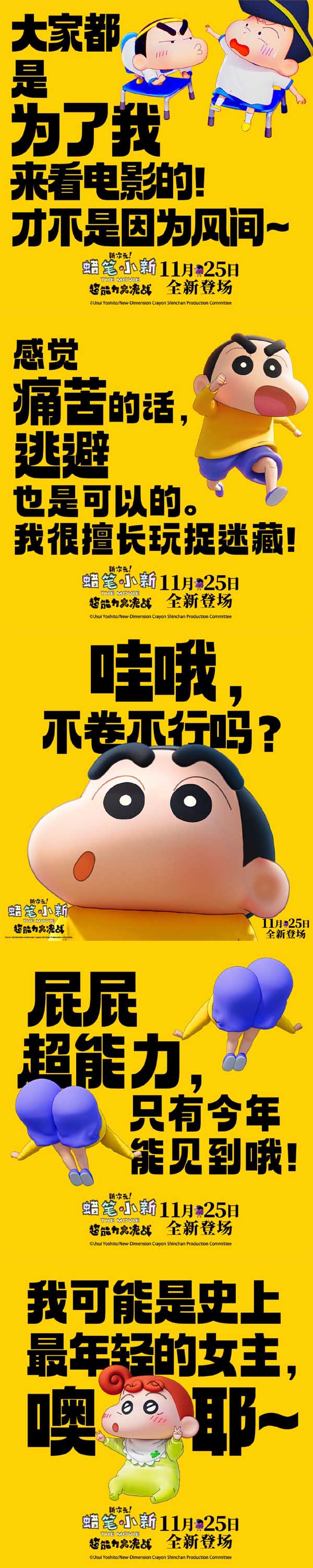 全球知名IP《蜡笔小新》系列的最新剧场版《蜡笔小新:新次元!超能力大决战》今日发布一组蜡笔小新百变萌趣组图。该片由大根仁编剧及执导,原作臼井仪人,故事讲述新之助意外获得超能力,而与新之助的超能力一同到来的,还有一场关乎世界命运的重大危机!影片日前正式宣布定档于11月25日在全国上映,新之助能否使用超能力拯救世界?让我们去影院揭晓答案!