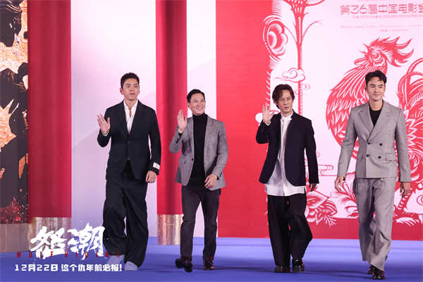 四位主创在红毯合影时一齐出拳,隔空与观众碰拳,也预告着电影《怒潮》将会在年末“重拳出击”。