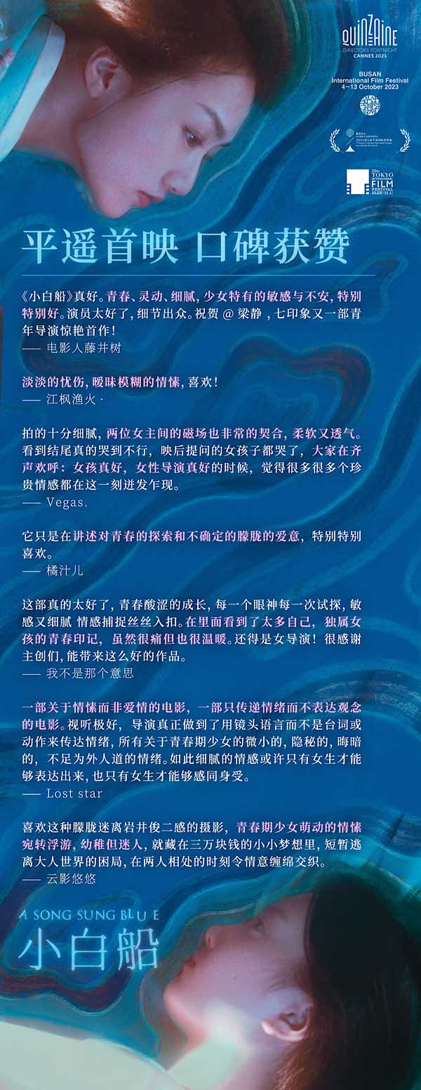电影《小白船》凭借细腻梦幻的光影刻画、躁动不安的青春故事以及纯净美好的情感表达,俘获了一众率先观影的影评人及观众,首映期间好评如潮!不仅有被影片中看似含蓄柔细实则直抵人心的情绪传达所震撼的,大赞其是“一部关于情愫而非爱情的电影,一部只传递情绪而不表达观念的电影”。还有被影片中对于青春与成人世界的探索触及到内心的,评价:“在里面看到了太多自己,独属女孩的青春印记,虽然很痛但也很温暖。”更有被两位女主之间柔软又坚定的情谊深深打动的,夸赞道:“两位女主间的磁场非常的契合,乘软又透气。看到结尾真的哭到不行,映后提问的女孩子都哭了,大家在并声欢呼‘女孩真好,女性导演真好’的时候,觉得很多很多个珍贵情感都在这一刻进发乍现。”