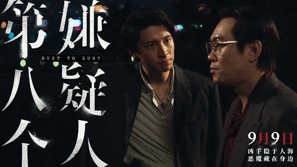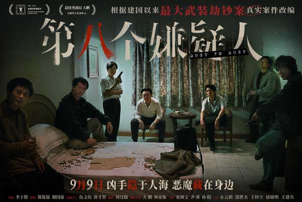 电影《第八个嫌疑人》根据1995年“1500万运钞车劫案”真实事件改编,由郑保瑞监制,李子俊执导,周汶儒编剧,大鹏、林家栋领衔主演,张颂文、齐溪、孙阳主演,由唯喜(苏州)文化发展有限公司、北京力加非凡影业有限公司、峨眉电影集团有限公司、众合千澄影业(无锡)有限公司、中国电影股份有限公司出品,常州东恒文化传播有限公司、上海有么字影业有限公司、龙和雄猫(北京)科技文化有限公司、嘉盛星耀文化传媒有限公司、华文映像(北京)影业有限公司、上海青璨文化发展有限公司、北京微梦创科网络技术有限公司联合出品,将于9月9日全国上映。