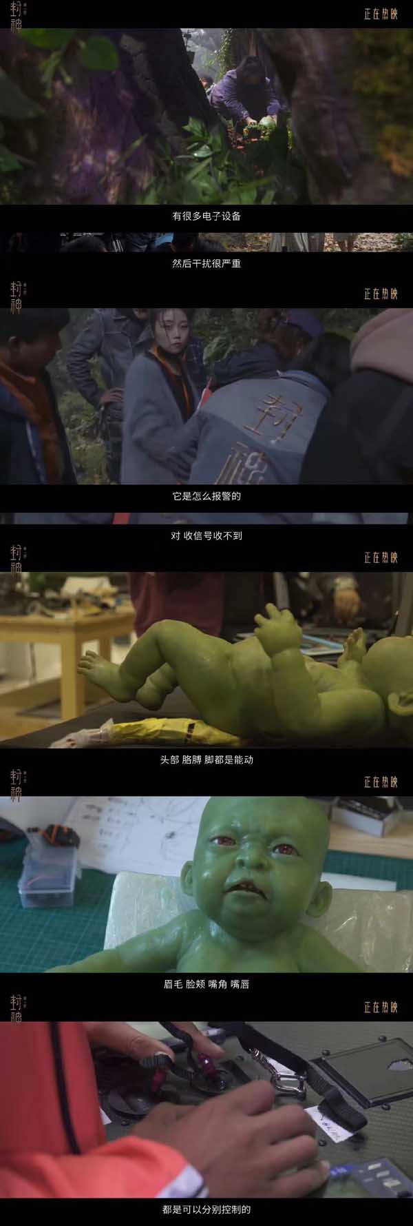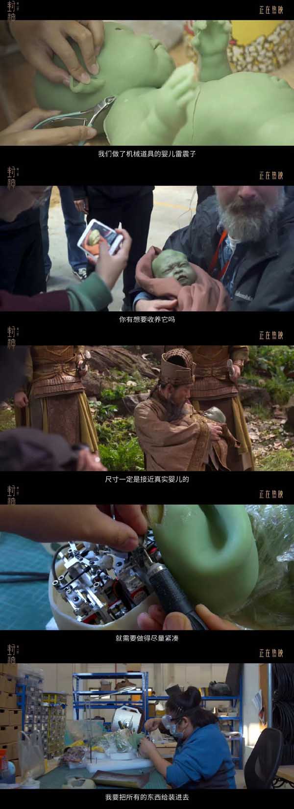 雷震子作为《封神三部曲》中最重要的数字角色,有着跟人类一样丰富的情感和复杂的表演,其形象设计难度在于从观众熟悉的角色特征中找到陌生感。根据小说《封神演义》里对雷震子的外貌描写“可煞作怪,弄的青头红发,上下獠牙,又长出两边肉翅”,概念设计团队在其“肉翅”上找到突破点,从海洋生物旗鱼或者斗鱼的鱼鳍获得了设计灵感。人物与异兽概念设计师四季表示:“长长的鱼鳍在水中漂浮,非常符合昆仑体系的那种优美的、比较神仙的感觉。”概念设计团队通过超高的设计精度和等比例的视效参考,给视效部门的工作提供了重要依据,让封神世界中的幻想角色与生物更真实立体地呈现于大银幕上。跨界创作者突破打造特殊道具 雷震子婴儿与比干心脏效果逼真电影《封神第一部》呈现了封神故事中的姬昌收养雷震子、比干剜心等诸多经典情节,特殊道具特辑揭秘了雷震子婴儿和比干心脏的特殊道具。中国电影从没有特效跨越式地发展到全CG特特效,中间缺少了物理视效的环节,导演乌尔善表示:“我们中国有艺术家,有科学家,有电脑方面的工程师,但是唯独缺少把这几个领域,结合在一起的跨界创作者,这个可能是我们整个中国电影行业都稀缺的跨界人才的组合。”雷震子婴儿的特殊道具就是一项取得创新性突破的跨界工作,首先由艺术家创造雷震子婴儿的形象,然后由做机械的艺术家完成其肢体和面部表情的机械结构设计,最后由三个控偶师共同操作其完成表演。特殊道具/机械装置副总监张穗透露,雷震子婴儿特殊道具的尺寸和重量都需要接近真实的婴儿,并要在很小的内部空间内安装复杂的电子机械零件,使其头部、胳膊、脚、眉毛、脸颊、嘴角、嘴唇不仅会动,还能分开控制。在控偶师团队的配合下,雷震子婴儿可以完成哭、笑、张嘴等面部表情、伸手蹬腿的动作,甚至可以完成眨眼、转眼珠、皱眉等细微神态。在拍摄现场,西伯侯姬昌的饰演者李雪健、姜子牙的饰演者黄渤皆赞叹雷震子的“演技”,也在表演中更有代入感。