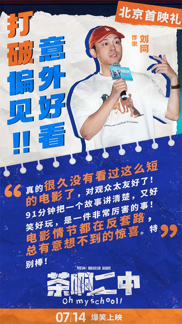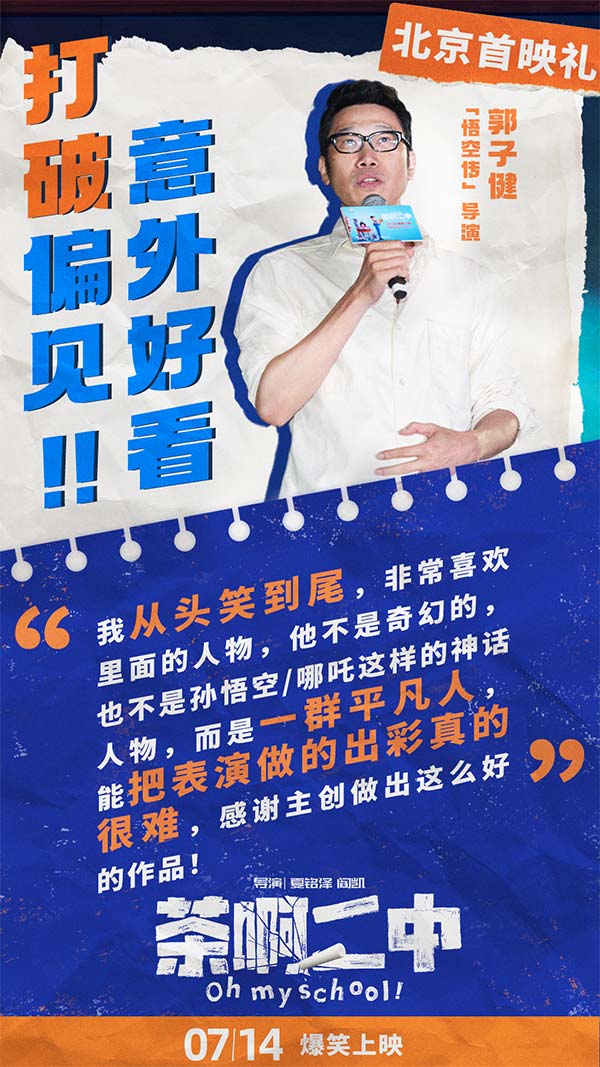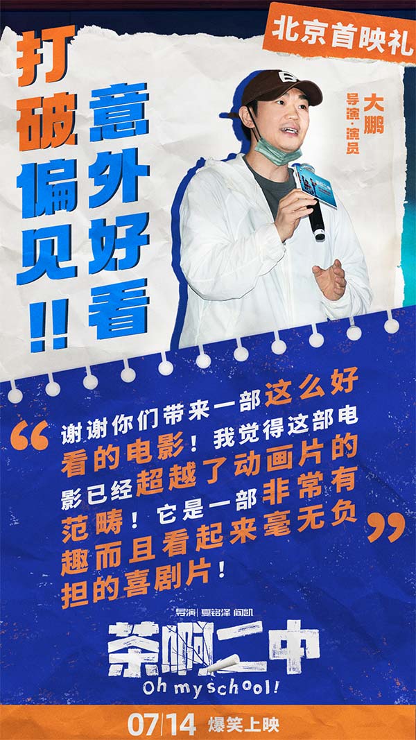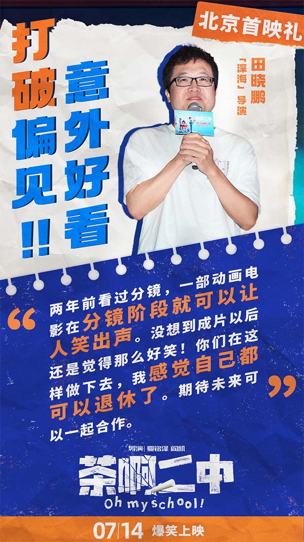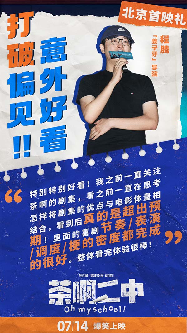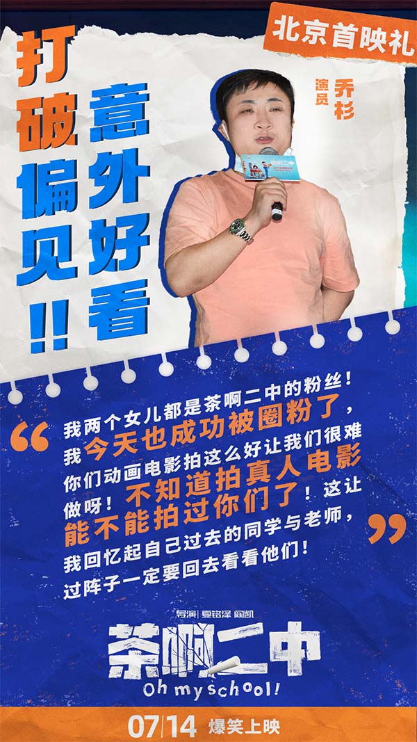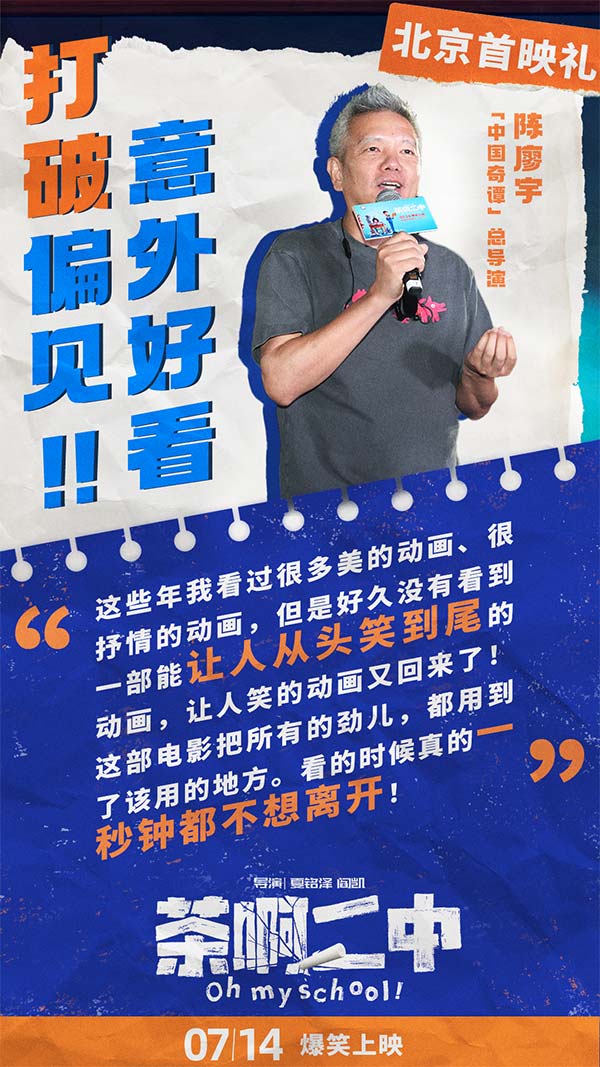 首映礼现场,观众们纷纷表示“被画风误导的好作品”,以为是给学生看的,没想到自己又笑又哭超乎预期的喜欢。全场观众集体“真香”,并被年轻的中国动画工作者真诚的态度和不放弃的精神所打动。陈建斌表示:“电影让大我想起了自己的学生时代,满足了每个人可能在学生时代都有过的幻想。”许多人观影后第一时间联系了自己的中学老师或同学,希望可以师生重聚一起重温那段最美好的青春记忆。无论是好笑的故事情节,还是成功人物塑造,或是跨越年龄与地域的普世情感,都让《茶啊二中》成为一部有深度有内涵,诚意满满的动画佳作。《悟空传》导演郭子健称“非常喜欢里面的人物,他不是奇幻的,也不是神话人物,而是一群平凡人”有观众观影后表示“每一个人和事在自己的生活中都能找到原型”。首映礼后《茶啊二中》旋即发布电影终极海报,海报中一众师生一起奔赴前方,有趣的是画面中大家各显神通,乘坐着五花八门的出行工具,热血中透露着中二,正如影片本身的风格。
