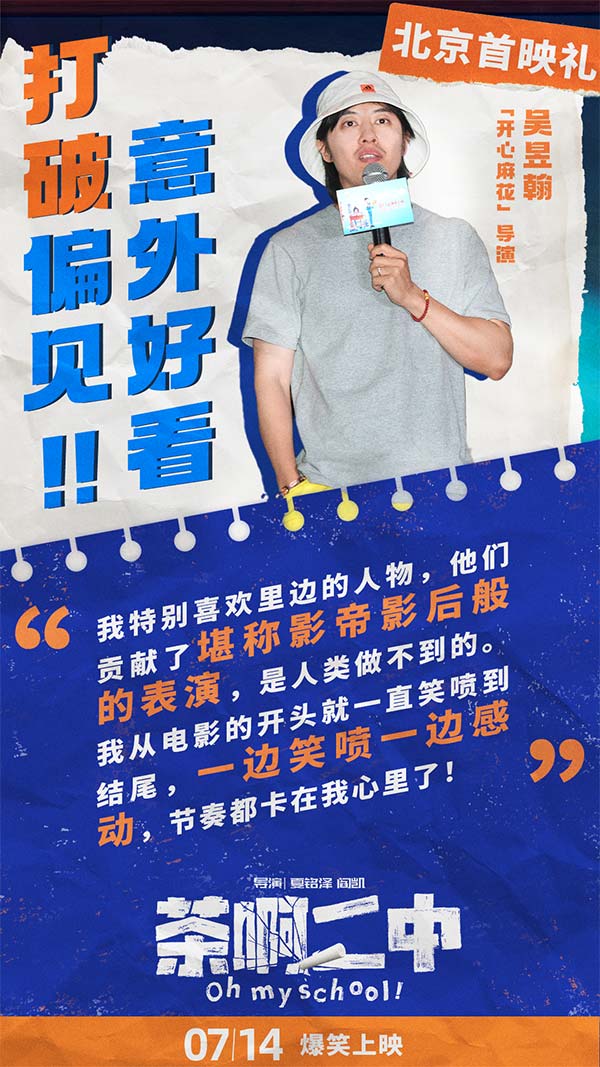 电影《深海》《西游记之大圣归来》的导演田晓鹏看完,对主创团队给予高度认可,感叹到“我知道你们(团队)是在怎样艰难的条件下做完的,如果给你们充足的条件,简直不可限量!自己都可以退休了!” 火遍全网的动画剧集《中国奇谭》总导演陈廖宇直言“看过很多美的动画、震撼的动画,但是好久没有看到一部让人从头笑到尾的动画,看得时候真的一秒钟都不想离开”。《茶啊二中》不单获得了行业内的前辈高度认可,同时也征服了行业外的喜剧人。徐峥称赞《茶啊二中》的成功是“一种天赋,一次勇敢,一种真诚,一次划时代。”乔杉陪两个女儿观影,称被电影成功“圈粉”并感言“动画电影拍这么好,让我们的喜剧片很难做呀!”大鹏大赞“这部电影已经超越了动画片的范畴!”开心麻花导演(《李茶的姑妈》)吴昱翰更是表示自己“从开头笑喷到结尾,节奏都卡在我心里了!动画角色贡献影帝影后级别的表演,是人类做不到的” 电影《茶阿二中》搭载动画想象力、扎实的剧本、源源不断反套路的笑料,提供了今夏最炸裂的观影体验。