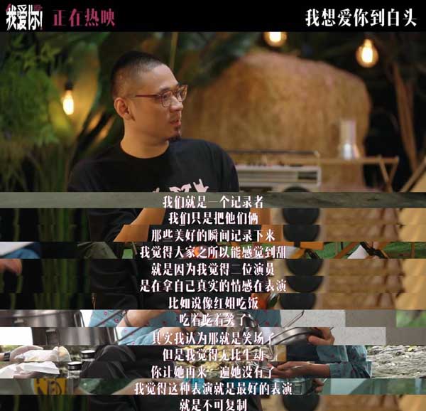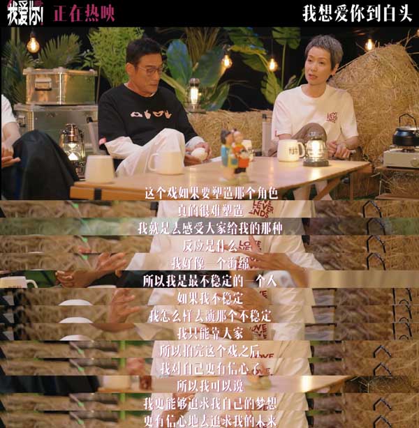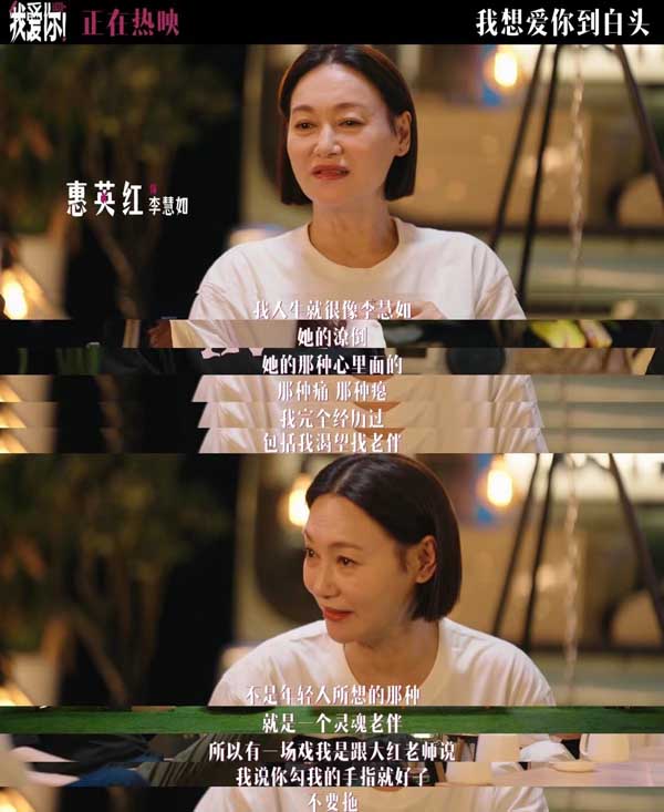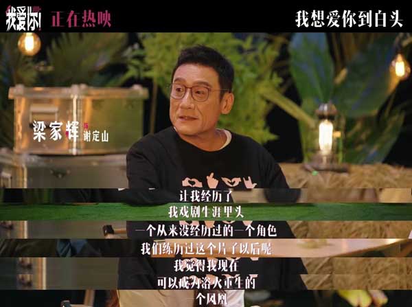 梁家辉也坦言表示谢定山是一个可以让自己全身心融入,在过往演艺生涯中前所未有的角色,戏中妻子发病疼痛时的声声呐喊让梁家辉沉浸在情绪中久久无法出戏,更是打趣自己不顾腰伤全情演绎是在“为艺术牺牲”,并感叹出演完《我爱你!》让自己涅槃重生,重塑新的自我。纪录片中,四位老戏骨都纷纷表示影片中真实细腻的情感呈现离不开“好对手”的彼此成就。叶童对其深有感触,她把自己比喻成一个海绵,感性地“吸收”大家的反应后,才能更加准确诠释赵欢欣游走于清醒与糊涂之间的状态,忘我演绎癌症发作时的痛苦模样。四位老戏骨抛开一切规则的束缚,跳出表演舒适圈,投入全部的情绪刻画两对爱人在生命尽头依旧勇敢相爱的美好与纯粹。无论戏内戏外,他们都纵情燃烧生命热情,用积极认真的人生态度去谱写一段绝美的动人乐章!