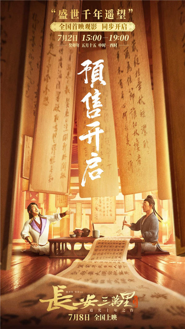 追光动画十年震撼钜献《长安三万里》由上海追光影业有限公司、北京阿里巴巴影业文化有限公司、天津猫眼微影文化传媒有限公司、中国电影股份有限公司出品,北京微梦创科网络技术有限公司联合出品,上海淘票票影视文化有限公司发行,天津猫眼微影文化传媒有限公司联合发行,谢君伟、邹靖执导,将于2023年7月8日全国上映,预售火热进行中。