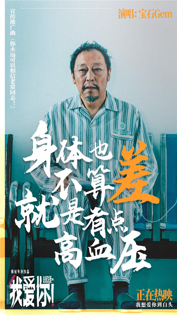 电影《我爱你!》今日发布的宣传推广曲由宝石老舅亲自操刀创作并惊喜献唱,活力四射的节奏、处处是梗的歌词一反传统印象中的老年人面貌,彰显片中主人公老常同志“活着就是躁”的精神态度。MV刻画了常为戒(倪大红 饰)勇敢热烈、不服老不服输的性格特性,展现了他年逾花甲却依旧活力的生活状态。他玩着游戏、喝着小酒、甩着鞭子,选择在生命尽头勇敢追求爱情,仿佛重新再活了一次,意气风发的模样让人觉得十分可爱。开启“人生最后一场热恋”的常为戒与李慧如(惠英红 饰)在城市间肆意漫游,享受着甜蜜的相伴,仿佛回到了年少时光;更在生命尽头收获“白发友谊”,他们与谢定山(梁家辉 饰)和赵欢欣(叶童 饰)夫妇在院中轻松惬意聚餐、尽情恣意玩水,那一刻好似重回青春年华,感受着世界上最灿烂的光照耀在身上的美妙。此外,MV也展现了“251天团”倪大红、惠英红、梁家辉、叶童四人戏外活泼可爱、默契互动的花絮画面,他们明亮灿烂的笑容彰显着的“251岁”青春的炙热美好,同时凸显老戏骨们无限的生命力量——活到老!演到老!