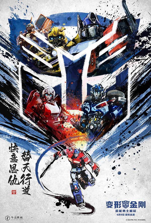 《变形金刚:超能勇士崛起》本次的故事相比于前作可谓十分颠覆,除了将时间线拉回90年代,还有幻影新晋亮相,巨无霸、恐惧兽两大阵营重磅登场,更有回归经典的变形动作,以及注入别样风味的说唱音乐,几乎处处焕然一新。而今日发布的海报也通过独特的风格带来了前所未有的震撼。在豪放飘逸的彩墨描绘下,各位变形金刚彰显英姿组成各自阵营的标志。汽车人无惧绝境,眼中蓝光闪耀着捍卫世界的坚定,在擎天柱的指挥下严阵以待;巨无霸蛰伏许久终觉醒,全力守护绿野深处的秘密,由擎天圣带领威震山林;恐惧兽侵袭地球,为非作乱引危机掀起黄土滔天,以天灾为首来势汹汹。一幅幅画面笔触强劲,用色鲜明,极具视觉冲击力。