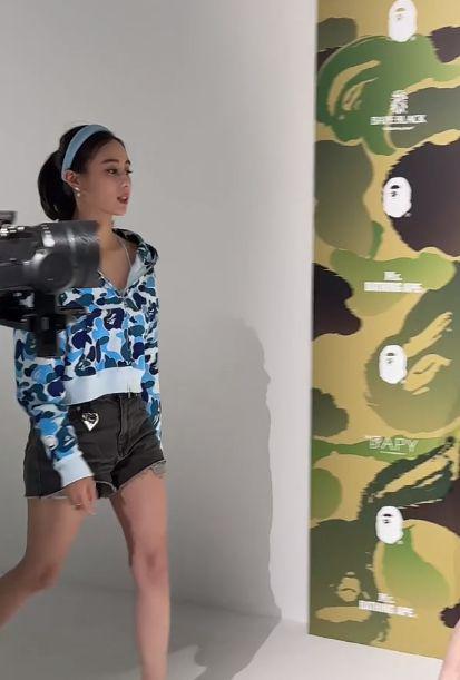首先是赌王最小的千金何超欣,她身着迷彩上衣搭配牛仔短裤,扎马尾辫头带发箍,一身装扮十分的随意,或许是为了迎合品牌的风格,所以才选择这身装扮。