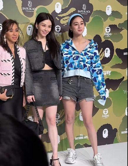 她旁边的是邱淑贞女儿沈月,沈月一身牛仔套装,虽然也是走休闲路线,但是里面的吊带和脚下的鞋子很成熟,显得她和何超欣走的风格不一样。