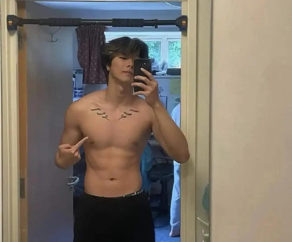 照片中可以看到,卢俊希继承了父母优良的基因,长相颇为帅气。虽说今年只有 18 岁,但腹肌已经特别明显了。