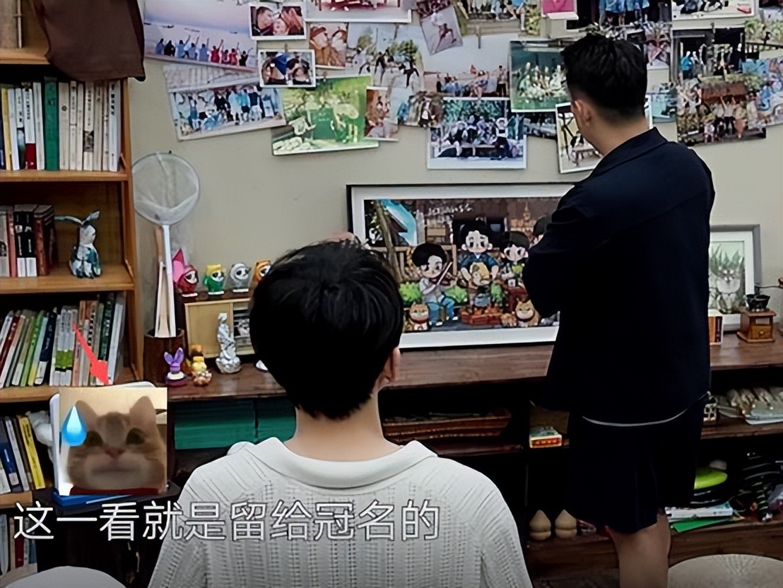 紧接着众人来到客厅的照片墙前,明明冠名商的牌子就摆在书柜旁边,黄磊却装模作样站在柜子前表示这块地方应该要摆放冠名商。