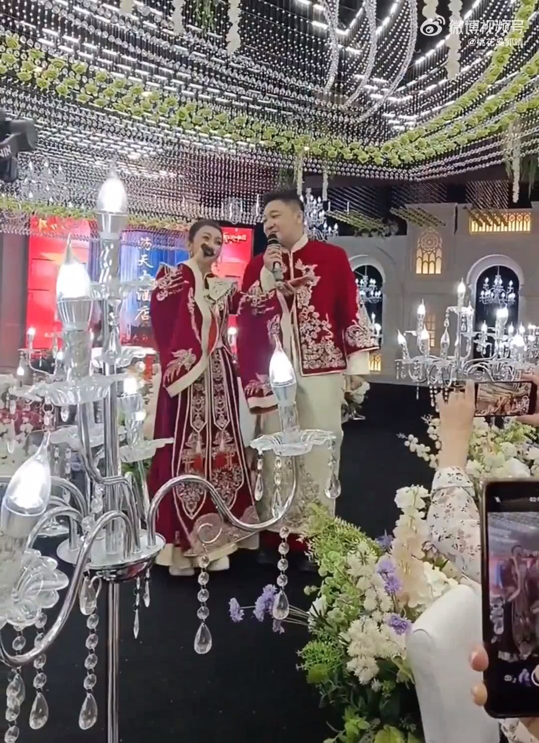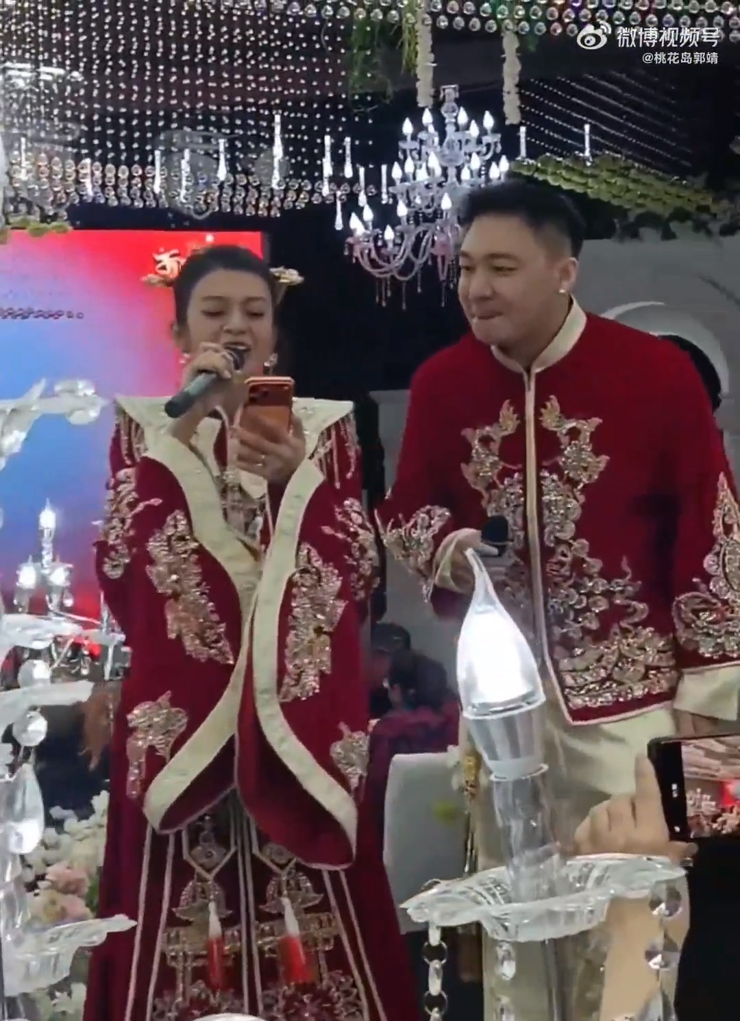 婚礼现场,谈莉娜和丈夫变身凤凰传奇,边唱边跳喜感十足,期间还不停感谢观众,有种演唱会的既视感,她还拿着手机像是在和亲友互动,也可能是通过直播的方式宣布喜讯。
