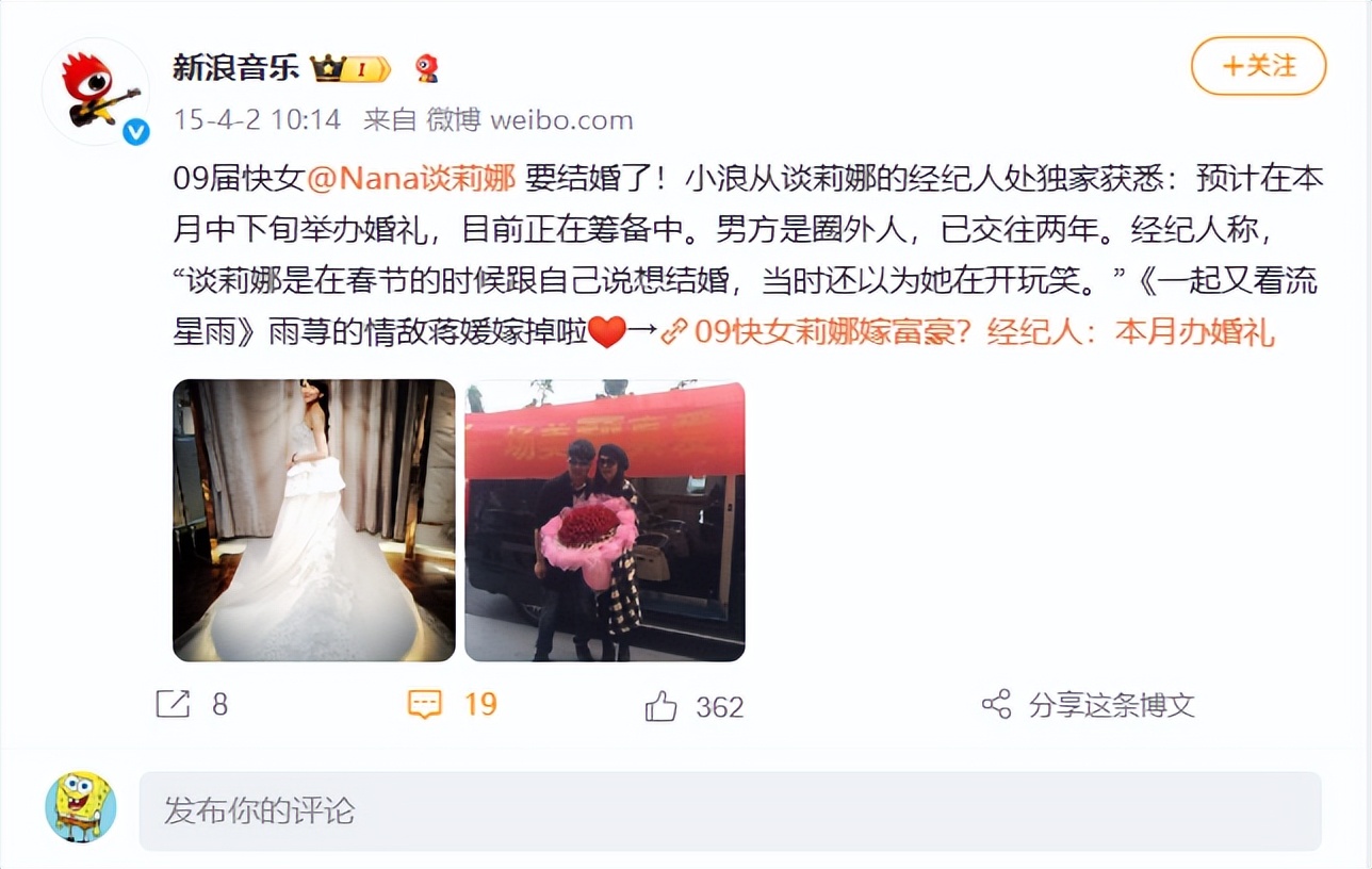 目前,谈莉娜本人尚未回应结婚一事,她是“09快女”选手,当时拿到全国第六,而谈莉娜还在《一起又看流星雨》饰演女二号蒋媛,与张翰、爽子饰演一对三角恋。