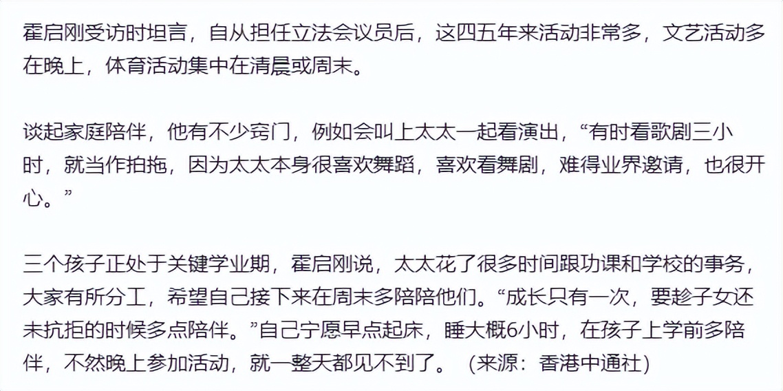 霍启刚很心疼郭晶晶,说她花了太多时间照顾子女的功课及学习,认为子女的成长只有一次,趁着子女还不抗拒就多陪伴,所以他也选择牺牲睡眠时间,每天早起看着子女上学,不然等晚上参加活动回来,一整天都看不到他们。