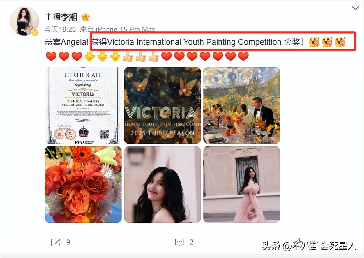 然而更匪夷所思的操作又来了,没有道歉的李湘,却在10月9日晚上,发了一条恭喜王诗龄获得了Victoria International Youth Painting Competition 金奖的消息。
