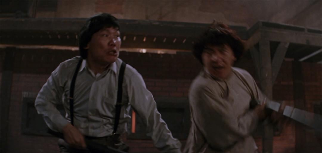 另外一场戏,他要用身体接住向下翻落的成龙,完全凭臂力和腰力撑住成龙才完成这惊险一幕。