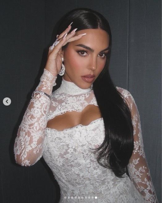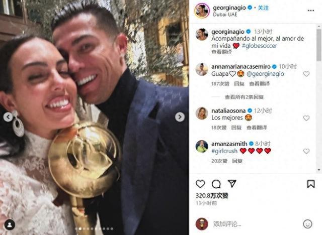 乔治娜晒出自己的照片以及与 C 罗的合影,并写道:" 陪我的一生挚爱、世界最佳出席颁奖典礼。"