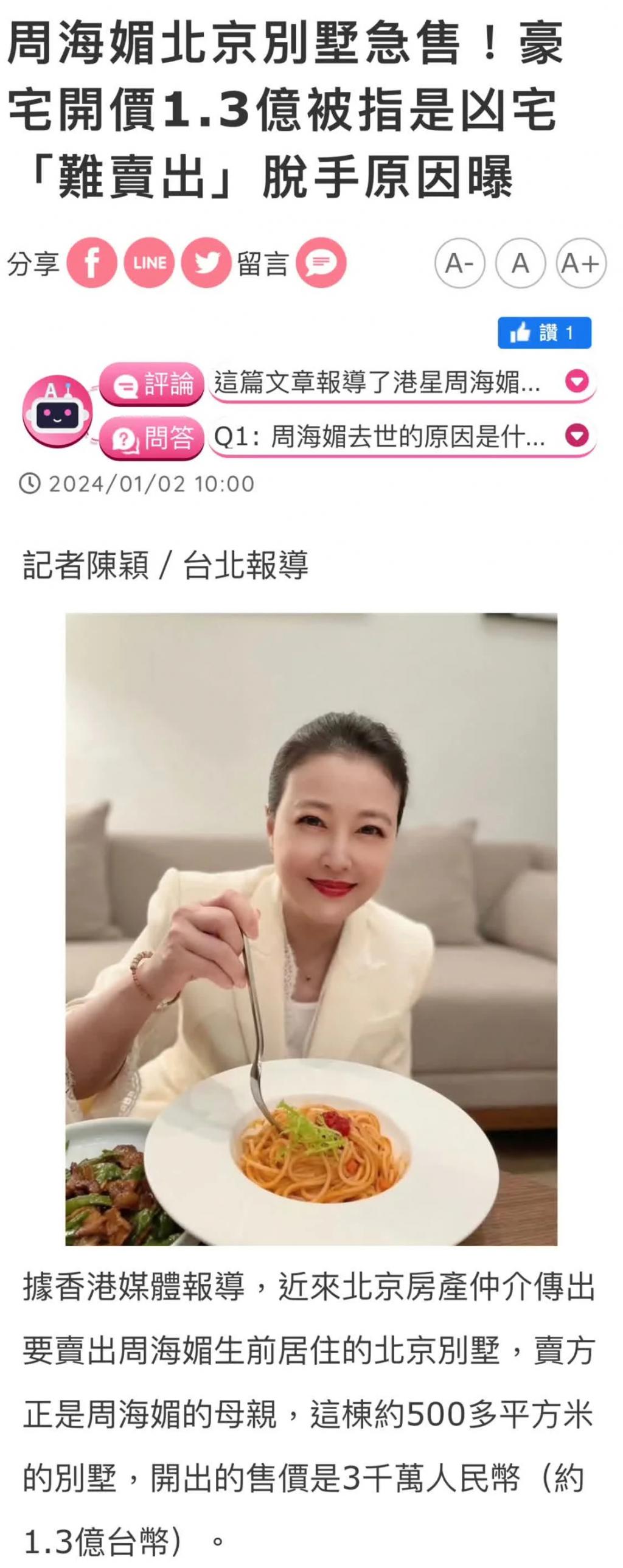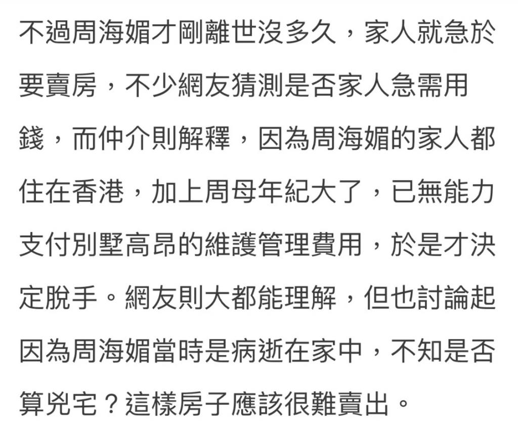 台媒称,周海媚才刚离世没多久,家人就急于要卖房,不少网友猜测是否家人急需用钱。而中介则解释,因为周海媚的家人都住在香港,加上周母年纪大了,已无能力支付别墅高昂的维护管理费用,于是才决定脱手。网友则大都能理解,但也讨论起因为周海媚当时是病逝在家中,不知是否算凶宅?这样房子应该很难卖出。