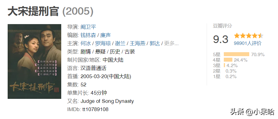 《大宋提刑官》这部剧的情节设定非常巧妙,悬念丛生,拍摄手法据说是借鉴了美剧的方法,采用了闪回、电脑特级等手法,在视效方面很有特色。但并没有摒弃原著,依旧是从案件本身和古代医学的角度切入,走的是纪实悬疑风。虽说这部剧是公认的好评,但我个人感觉太拖沓了,节奏太慢,一遍遍地复述生怕观众看不明白,整体来说瑕不掩瑜吧。