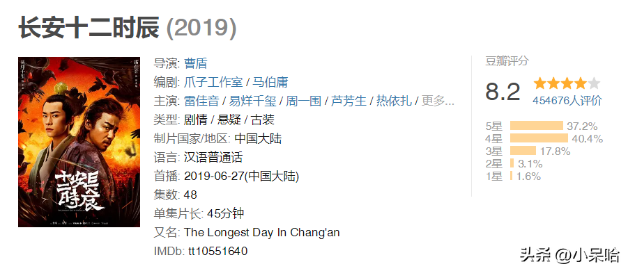 《长安十二时辰》这部剧唯一的槽点就是中期剧情过于拖沓,但并不妨碍它给国产古装探案剧填上了浓墨重彩的一笔 。每一个角色都很有特点,每一位演员也都演技在线,该剧聚焦的是很多个小人物的喜怒哀乐和挫败成长,映射出对家国的热爱与忠诚。最值得一提的是,该剧的服道化、场景都异常精美,至今没发现有哪部剧能与之争锋。