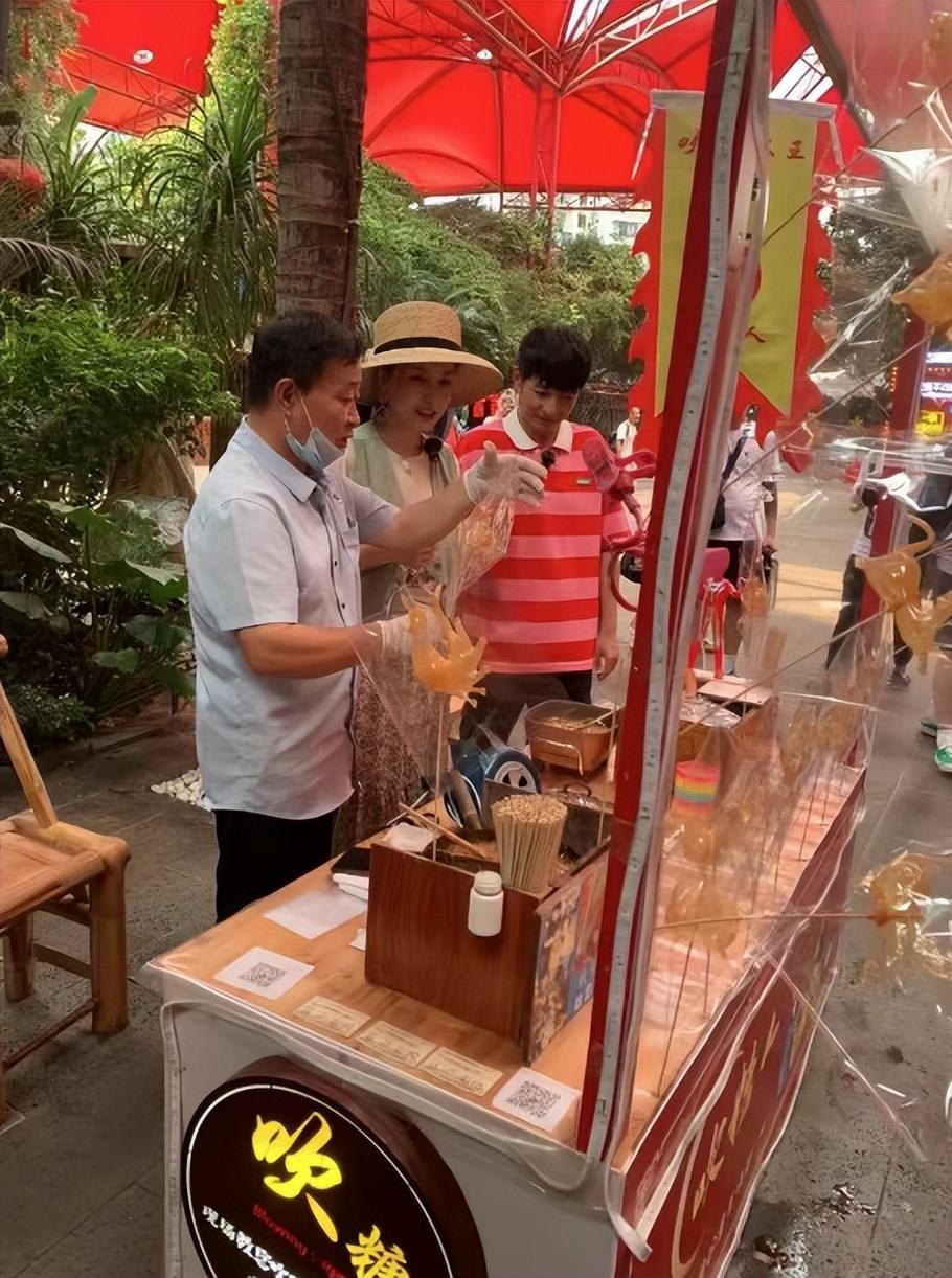 体验吹糖人的吴昕,吹气吹得眼睛都瞪圆了,腮帮子鼓鼓的,小模样看起来十分可爱。