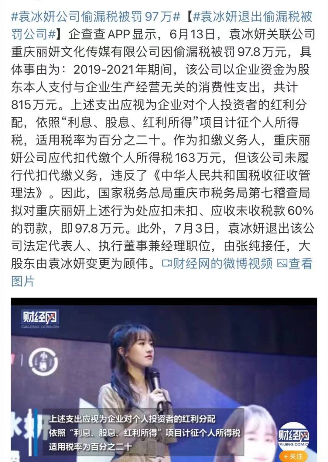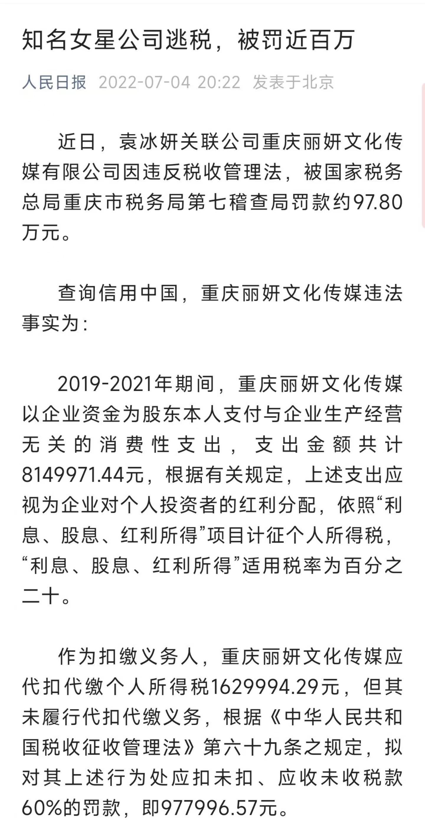 有媒体发布消息,称女演员袁冰妍的关联公司重庆丽妍文化传媒有限公司因违反税收管理法,被国家税务总局重庆市税务局第七稽查局罚款约97.80万元。