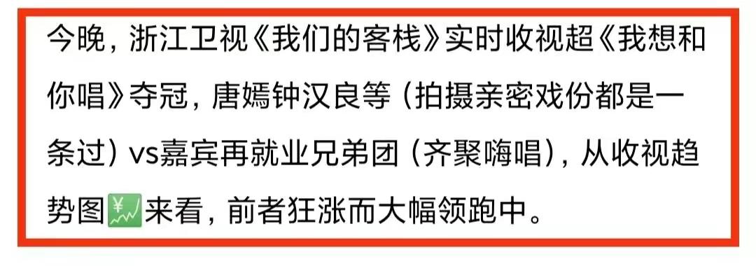 果不其然,这一期浙江卫视《我们的客栈》同时段收视一度超过了湖南卫视《我想和你唱》,流量狂涨并大幅领跑;