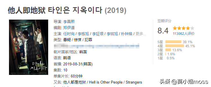《他人即地狱》是2019年上线的一部悬疑惊悚犯罪剧,由李栋旭、任时完主演,11万人给这部剧打出了8.4分。该剧改编自漫画《惊悚考试院》,惊悚刺激悬疑程度一点不输于原著漫画。