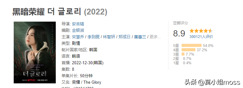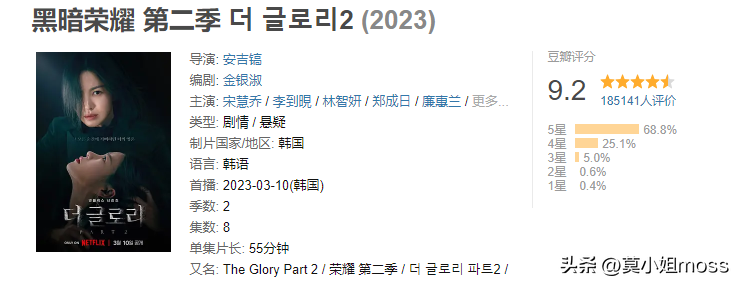 《黑暗荣耀》系列是2023年开年的黑马剧,宋慧乔也借此剧翻身,两部剧收获了超过48万人点评,豆瓣评分分别是8.9分与9.3分。