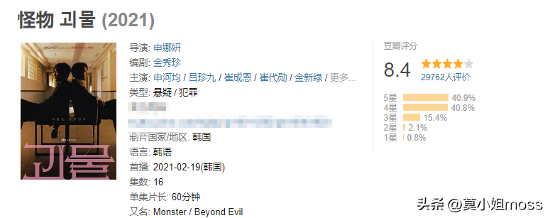 《怪物》由申河均及吕珍九主演,豆瓣评分达到了8.4分。这部剧集齐了19禁、惊悚、罪案、悬疑等元素。