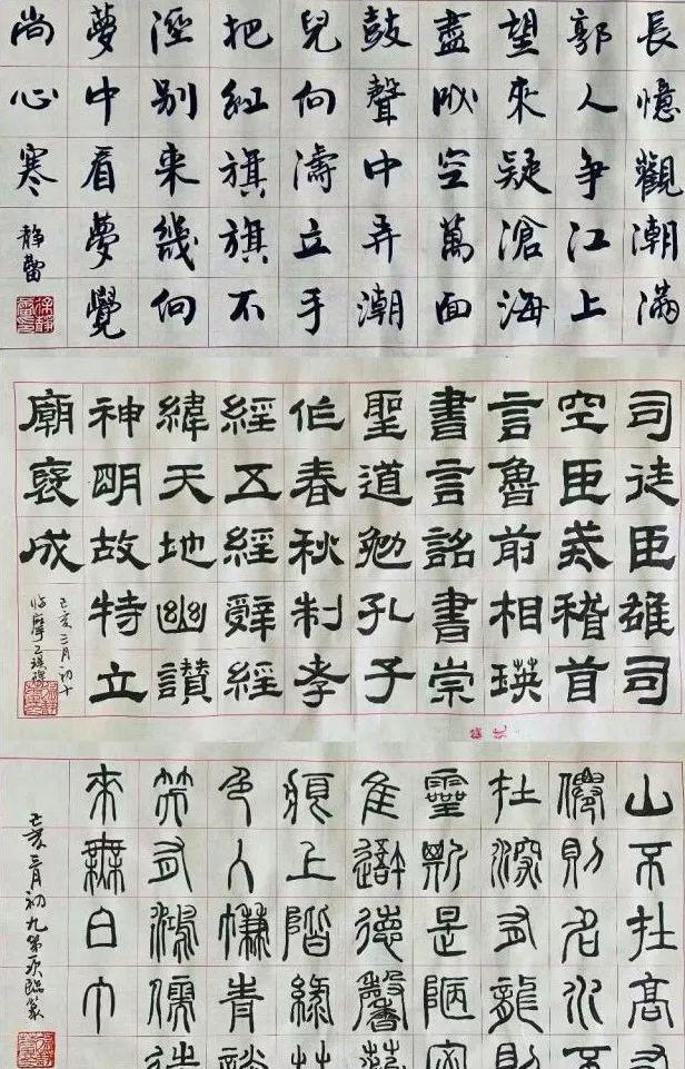 从徐静蕾写的多幅行书作品中可以看出,她的书法完全不是那种江湖字体,每一笔每一画都有传承,篆隶楷行草样样都在传统书帖的法度之内书写着,并且,她把许多字帖临摹得像模像样,不论是字体间架结构的组合,还是对用笔力道的掌控,还是对整体气韵的连贯性处理,她都做得很不错。