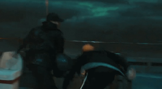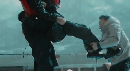 三个男人在暴风骤雨中扭打到一起,其中二人,合力将一个凶神恶煞的男人制住。