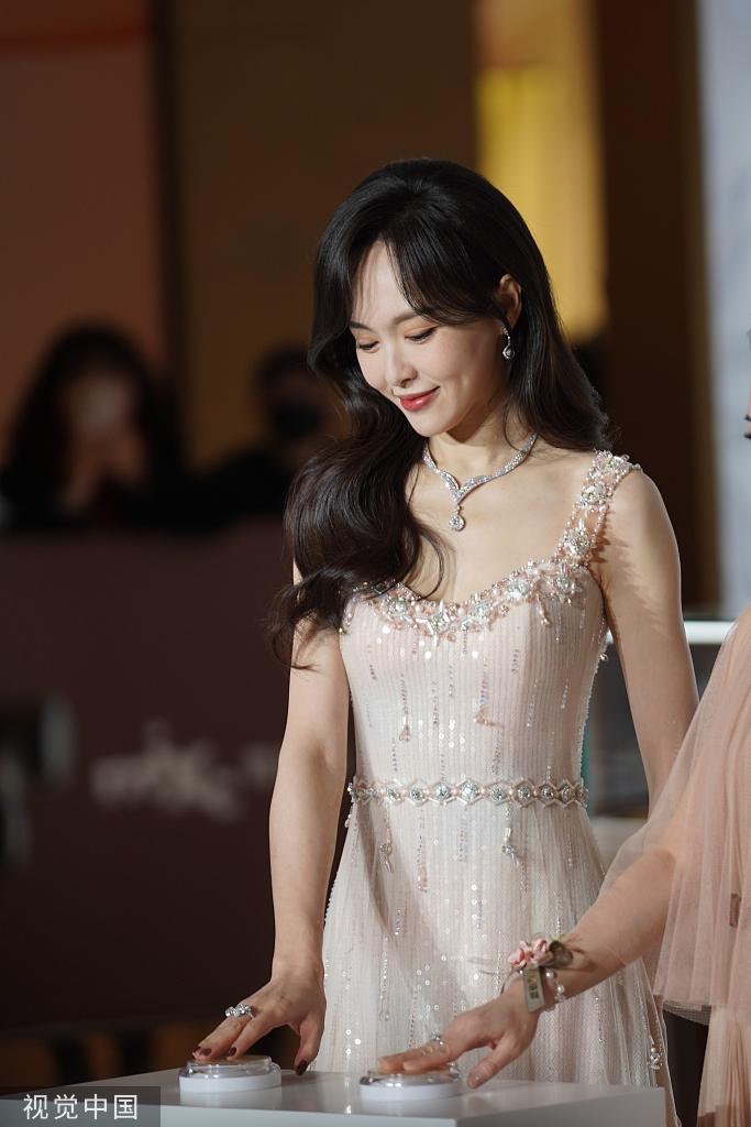 唐嫣身穿金色吊带礼服裙,气质温婉大气。