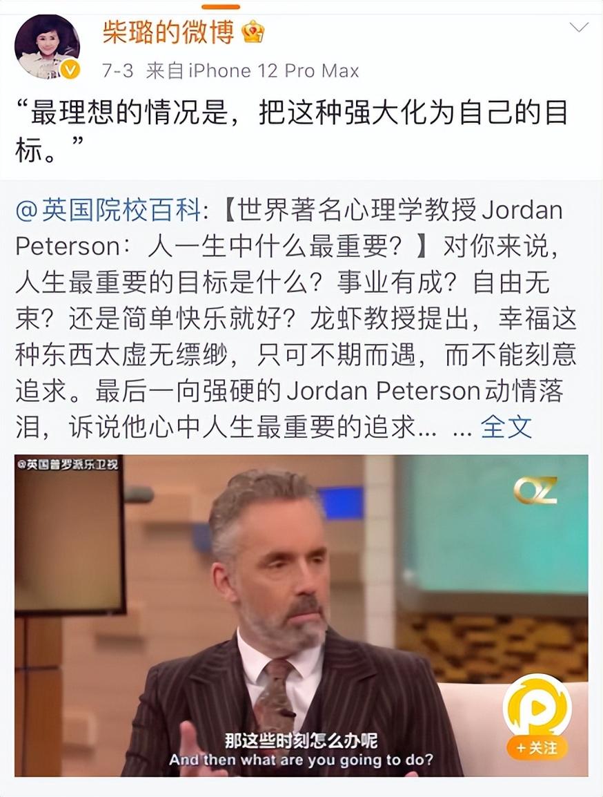 不过柴璐似乎并不担忧,她经常在自己的个人社交账号分享自己的从各种地方学到的人生道理,去年7月还分享了一则英文视频,并分享了自己总结的人生道理。