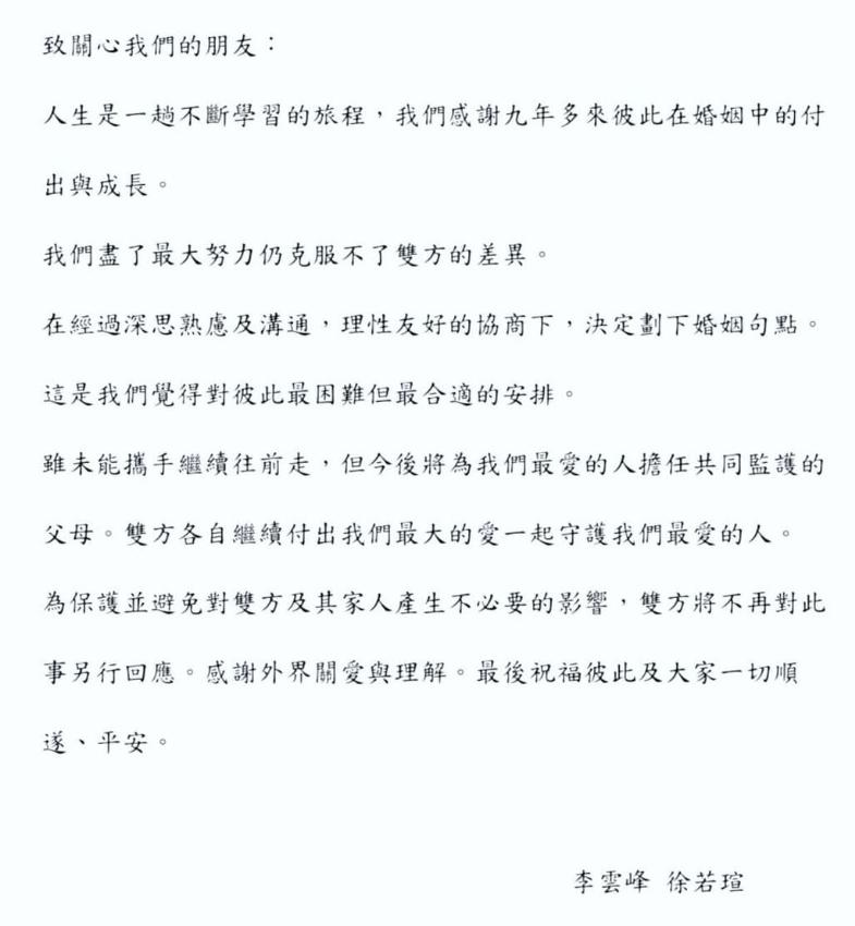 徐若瑄在声明中指出,尽了最大努力仍克服不了双方的差异,经过协商决定离婚。