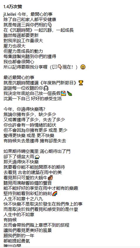 李靓蕾在文中表示,今年最开心的事是每周三更新节目与网友互动,工作的压力变成动力,又表示最近最开心的事是自己节目成为热门。