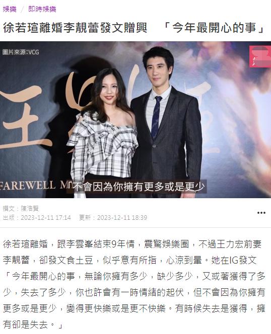 12 月 10 日,徐若瑄发文承认与李云峰结束 9 年婚姻,在外界看来是意料之中。