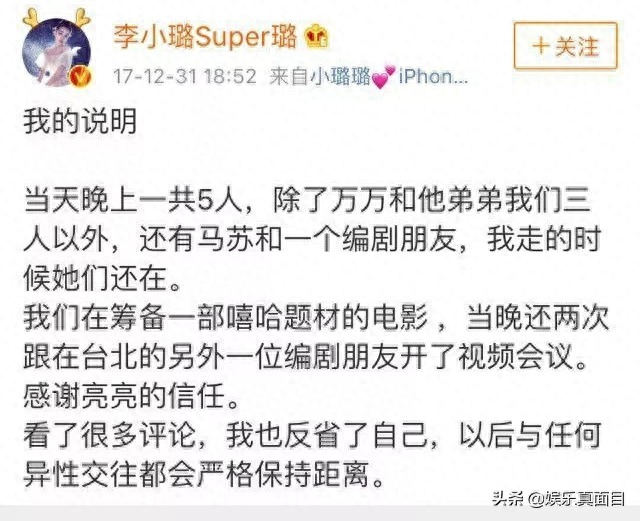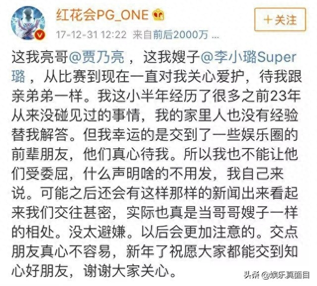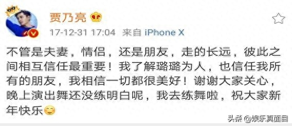 贾乃亮也发微博称,了解李小璐的为人,相信李小璐。